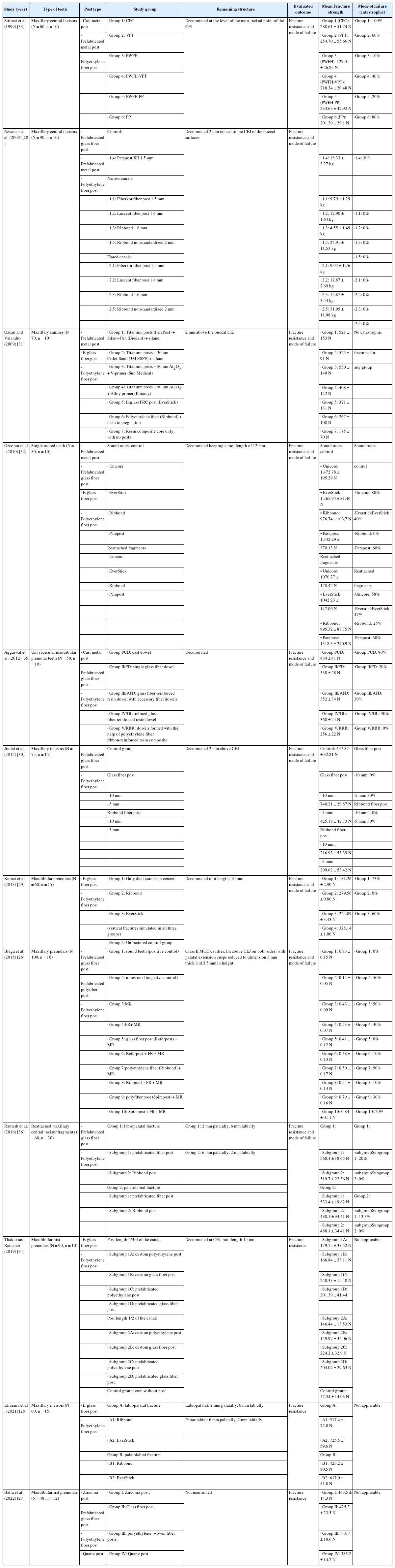 • Studies included endodontically-treated permanent teeth, restored with different types of post and core systems