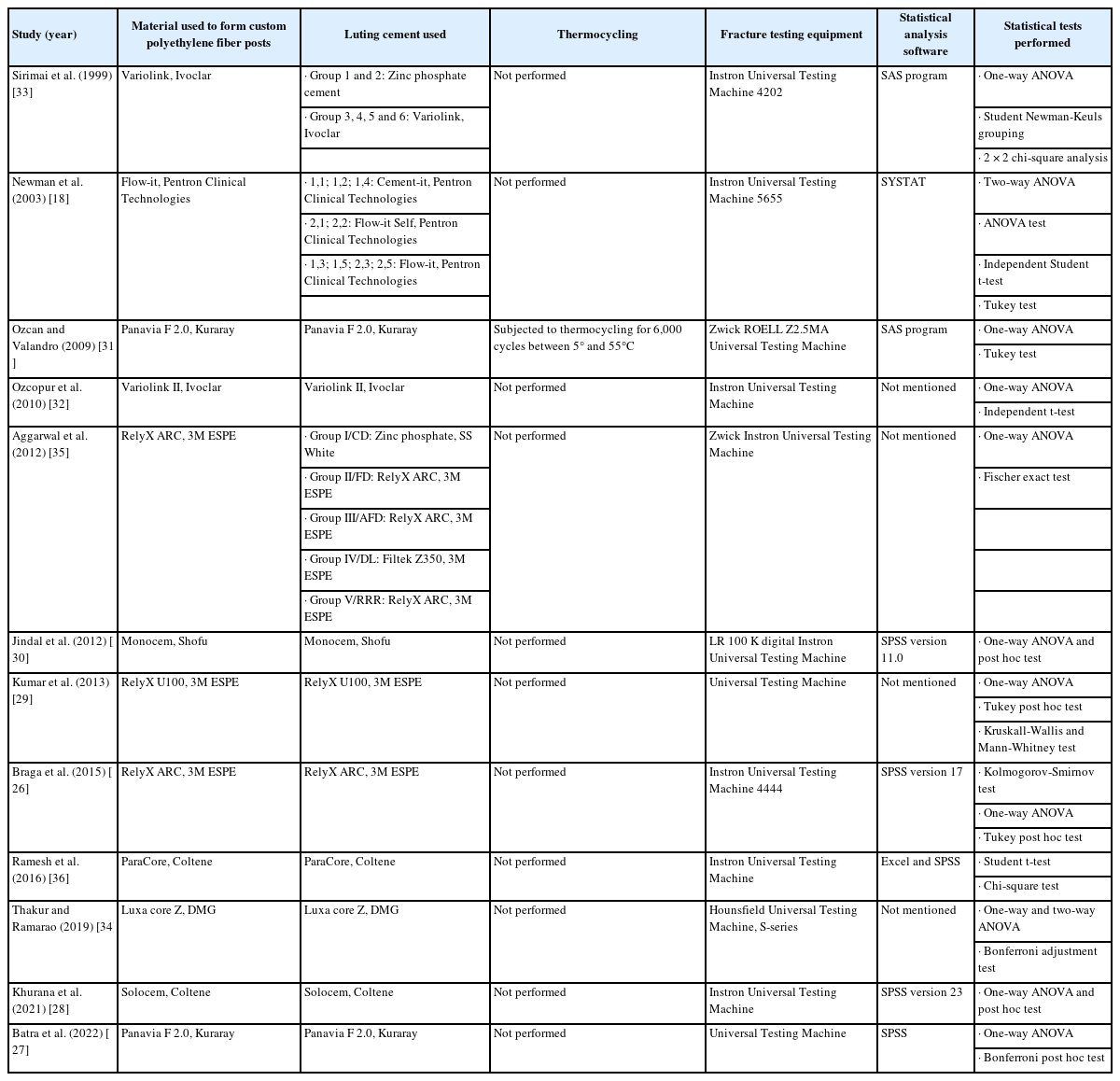 For all the selected studies, the following information was reported: authors, year, type of teeth, post type, study groups, remaining tooth structure, evaluated outcomes, mean fracture strength, mode of failure, luting agent used, thermocycling, fracture testing equipment used, statistical analysis software used, and statistical tests performed. Studies with homogeneous study populations were subjected to meta-analyses using a fixed-effect model. Only if the heterogeneity was substantial (>50%) then a random-effect model was employed.