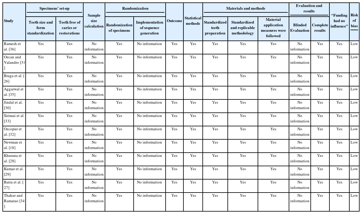 For risk of bias analysis, two separate reviewers were appointed to analyze each individual study. The domains used for the quality assessment were based on the reporting of items as per the modified CONSORT (Consolidated Standards of Reporting Trials) statement for in vitro studies [25] which were: teeth size and form standardization, teeth free of caries or restorations, sample size calculation, randomization of specimens, implementation of sequence generation, outcome, statistical methods, standardized teeth preparation, standardized and replicable methodology, material application measures followed, blinded evaluation, complete results, and funding. When a study described a domain, it was allotted ‘yes’ and if it failed to describe a domain ‘no information’ was allotted. If 10 to 13 domains were described, the study was determined to have a low risk of bias. If seven to nine domains were described, the study was determined to have some concerns or a moderate risk of bias. If less than seven domains were described, a high risk of bias was reported.
