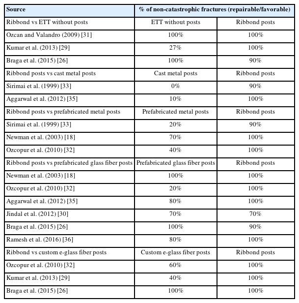 Table 4 shows the fracture patterns and modes of failure of different post systems as compared to those of Ribbond posts. As evident from the incidence rate of catastrophic vs non-catastrophic fractures, Ribbond posts consistently showed a favorable mode of fracture across all the included studies. Cast metal posts showed the most unfavorable fractures followed by prefabricated metal posts, prefabricated glass fiber posts, and custom e-glass fiber posts in decreasing order.