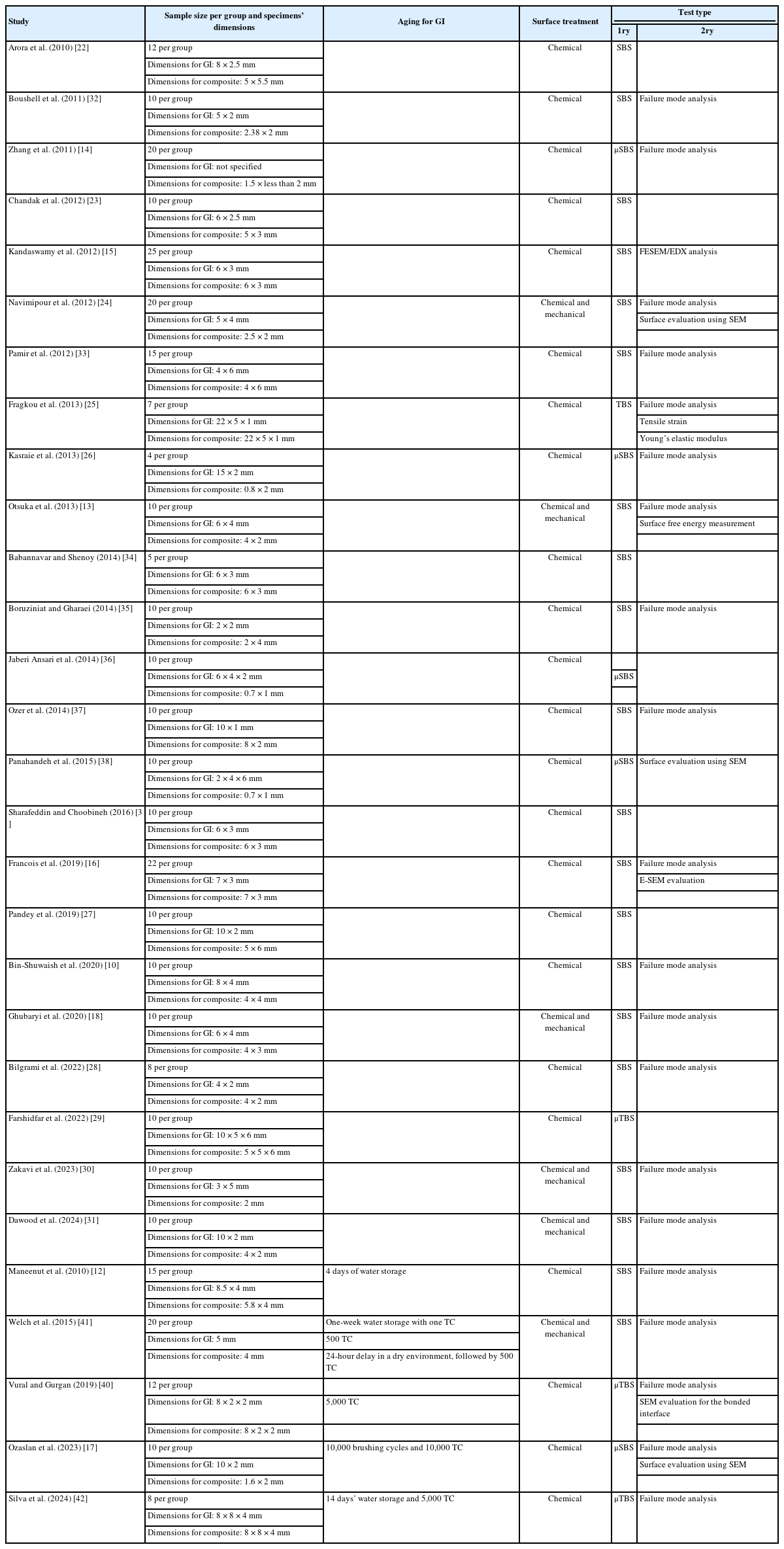 | Study | Sample size per group and specimens’ dimensions | Aging for GI | Surface treatment | Test type |