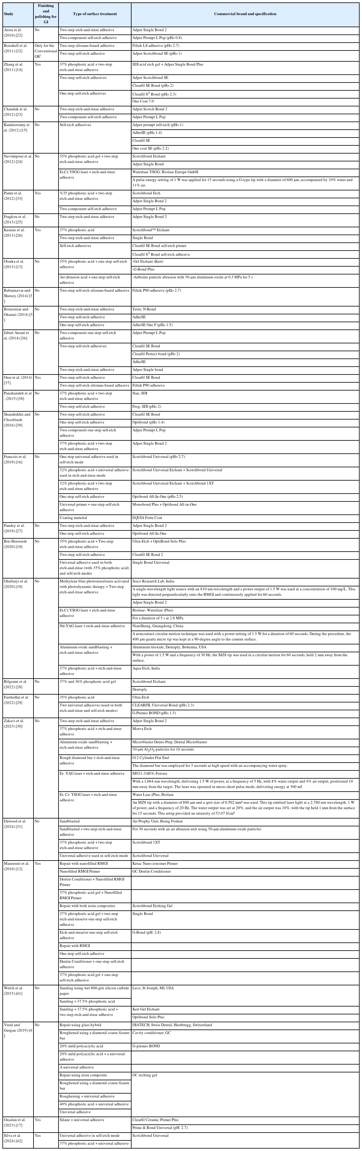 | Vural and Gurgan (2019) [40] | No | Repair using glass hybrid | DIATECH, Swiss Dental |