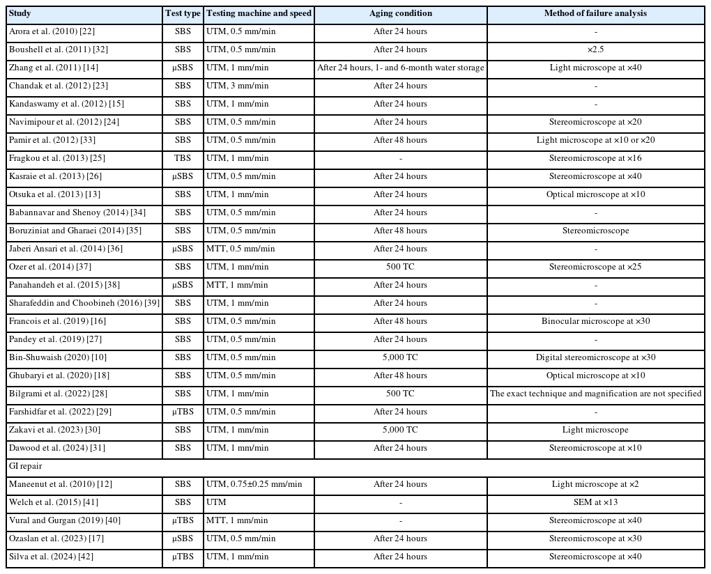 GI, glass ionomer; SBS, shear bond strength; μSBS, microshear bond strength; TBS, tensile bond strength; μTBS, microtensile bond strength; MTT, microtensile tester; SEM, scanning electron microscope; TC, thermal cycle; UTM, universal testing machine.