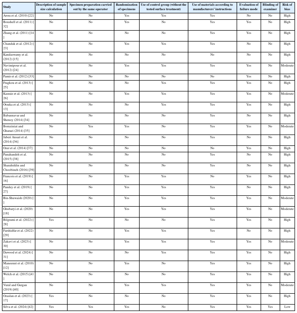 | Study | Description of sample size calculation | Specimen preparation carried out by the same operator | Randomization of specimens | Use of control group (without the tested surface treatment) | Use of materials according to manufacturers’ instructions | Evaluation of failure mode | Blinding of examiner | Risk of bias |