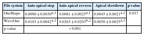 Table 2.The preparation time in terms of three different apical functions and two file systems