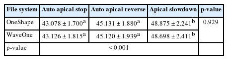 Table 1 shows the mean and standard deviation values of the apically extruded debris based on the different apical functions and file systems. Regardless of the used apical functions and file systems, OneShape and ASD were associated with statistically lower debris extrusion, respectively (
