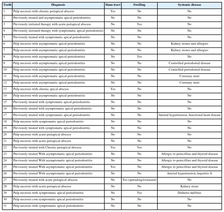 Twenty-three Hispanic patients, with an average age of 53 years (range, 16–80 years), presented a total of 31 teeth. Among the inclusion criteria were all teeth that had higher lesion apical, incisive, canines, premolar, and molar with type I, II, and IV. The systematic condition and pulp and periapical diagnosis of the teeth are presented in