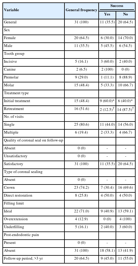 Using loose criteria, out of 31 cases, the majority of cases showed a reduction in the size of apical lesions. In total, 18 cases (58.1%) were considered successful, considering cases with tomographic repair and those in the process of repair. Males had a higher success rate at 72.7% compared to females at 55.0%. When considering the type of treatment, teeth that received initial treatment achieved an 80.0% success rate, while retreatments reached a 37.5% success rate. Direct restorations had a success rate of 75.0% when compared to restorations with crowns at 52.2%.