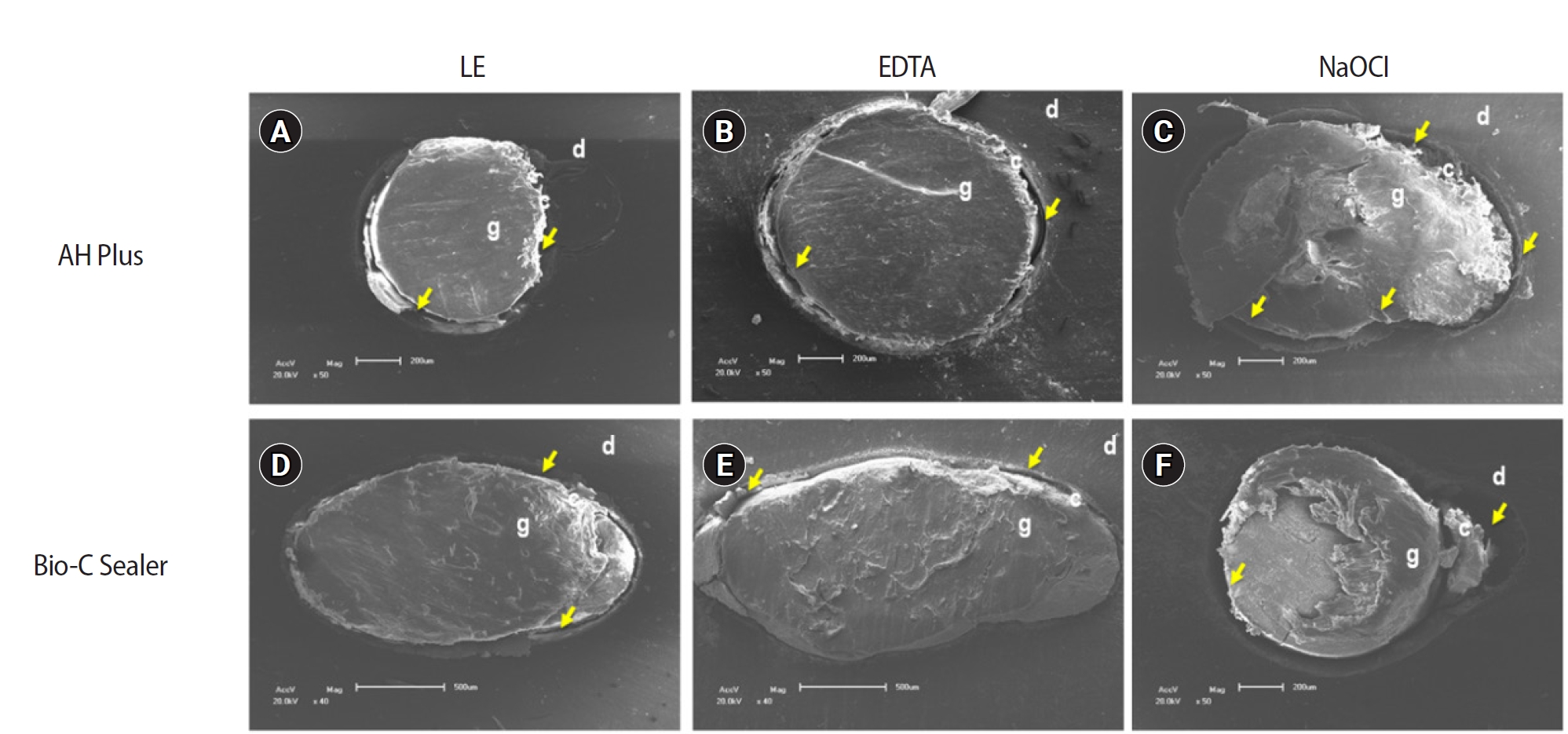 Areas of misfitting (yellow arrows) and adaptation at the adhesive interface between the gutta-percha cone (g), root canal sealer (c), and root dentin (d) in the different final irrigating solution types (limonene extract [LE], ethylenediaminetetraacetic acid [EDTA], and sodium hypochlorite [NaOCl]). For the epoxy resin-based sealer group (AH Plus; Dentsply De Trey, Konstanz, Germany) treated with LE (A) and EDTA (B), and Bio-C sealer group (Bio-C Sealer; Angelus, Londrina, Brazil) treated with LE (D) and EDTA (E), it is possible to observe adaptation at the adhesive interface, with integrity of the obturation margins and a lower percentage of gaps. In NaOCl, regardless of the experimental group, sealer predominance can be observed in the polar areas (C and F) with areas of misfitting.