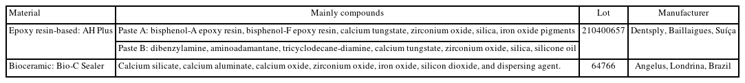 The canals were obturated using the single-cone technique with WaveOne Gold Conform Fit Medium 35.06. The groups were divided into two subgroups: one obturated with ERB sealer (AH Plus; Dentsply De Trey, Konstanz, Germany) and the other with Bio-C Sealer (Angelus, Londrina, Brazil) (Table 2). The roots were stored in an incubator at 37°C for 3 days. All procedures, including biomechanical preparation and obturation, were performed by the same operator.