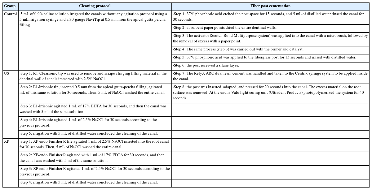 Group 2 (XP): The XP-endo Finisher R file was coupled to a VDW Silver motor and operated in continuous rotation at a speed of 800 rpm with a torque of 1 Ncm inserted 0.5 mm from the apical gutta-percha filling. The file was agitated with 1 mL of 2.5% NaOCl, which was inserted into the root canal for 30 seconds. Then, 5 mL of NaOCl washed the entire canal. After this, the file was agitated with 1 mL of 17% EDTA for 30 seconds, and then the canal was washed with 5 mL of the same solution. In the next step, 1 mL of 2.5% NaOCl was agitated for 30 seconds according to the previous protocol. Finally, irrigation with 5 mL of distilled water concluded the cleaning of the canal.