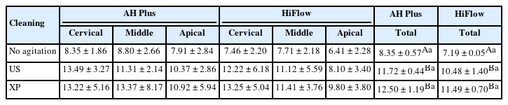 p > 0.05). The ultrasonic and XP agitation groups did not show a statistical difference for canals obturated with AH Plus (