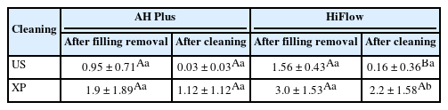 In micro-CT, there was no statistical difference between the different types of sealers for the same cleaning protocol. Only for the HiFlow group was a statistical difference observed in the removal of remnants after the cleaning protocol with ultrasonic tips (