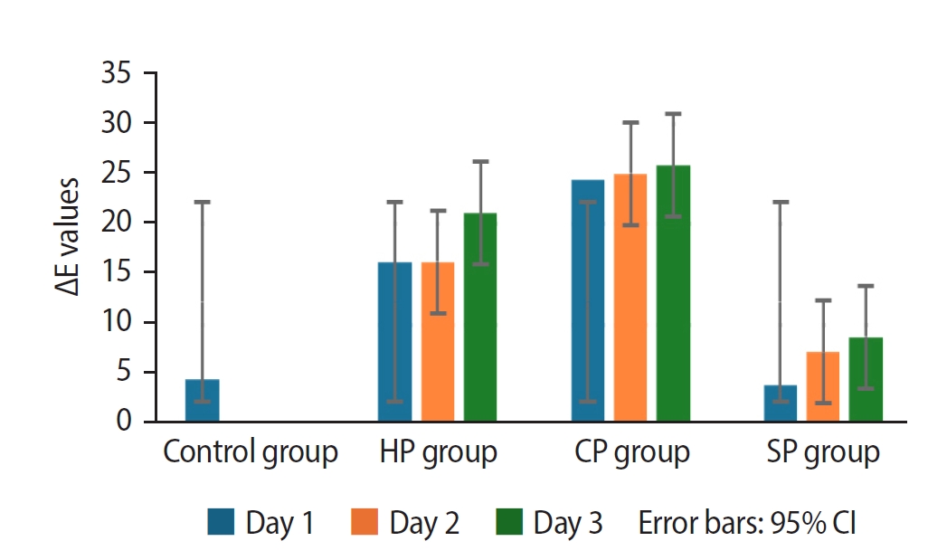 The L* value represents the lightness-darkness coordinate of color, and an increase in this value is anticipated throughout the bleaching treatment. In the present study, a statistically significant difference in L* values was observed among the groups. The most notable increase in L* value was recorded in the CP group, whereas the least significant increase occurred in the SP group.