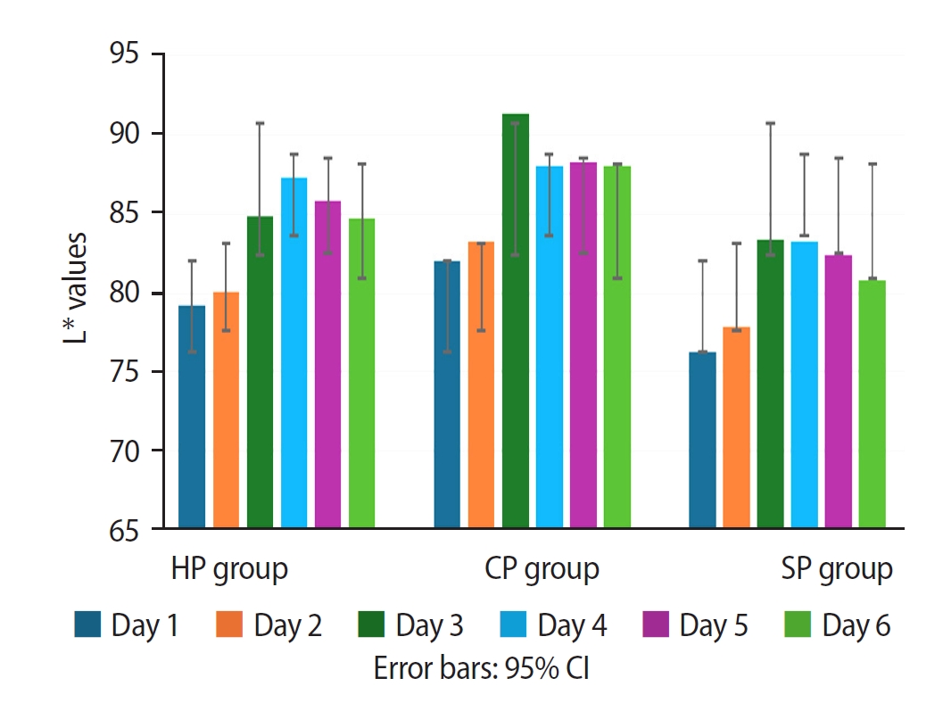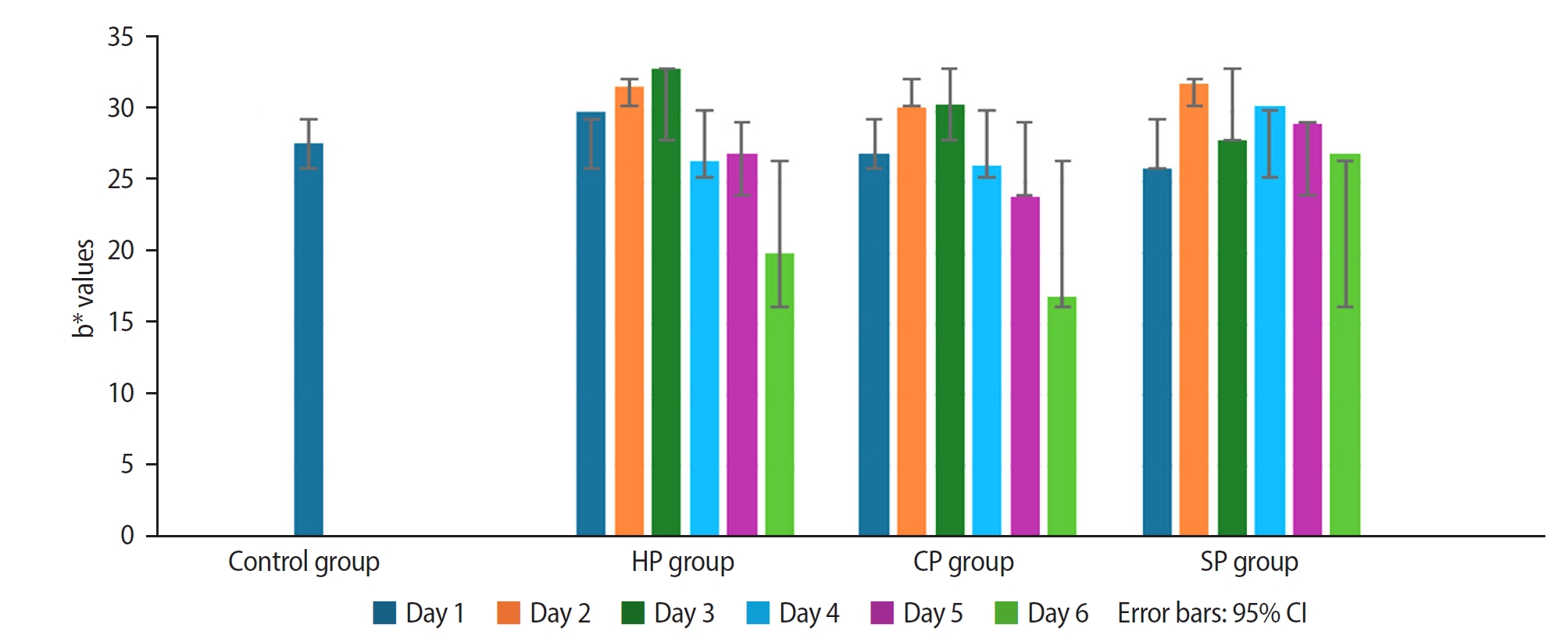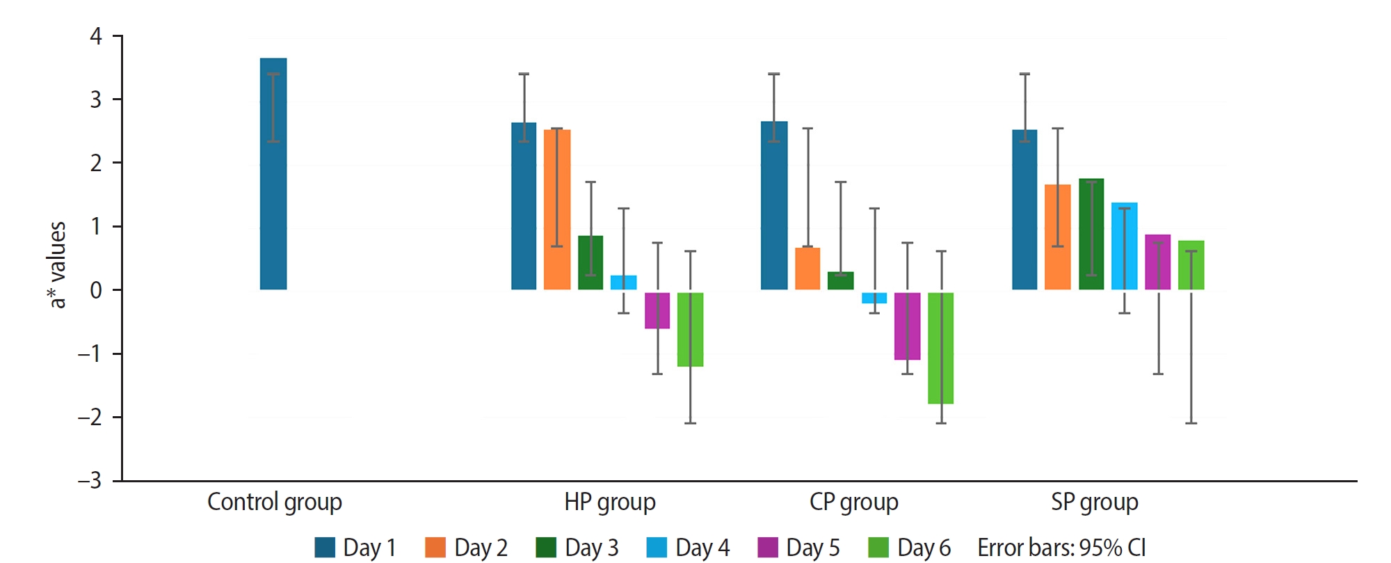 The a* value reflects the red-green coordinate of color, with the expectation that initially elevated values will decrease over time. A comparative analysis of the mean a* values demonstrates a significant discrepancy between the study groups and the control group. Within each experimental group, the most pronounced decrease in mean a* value is observed in the CP group, followed by the HP group, while the SP group exhibited the least significant reduction.