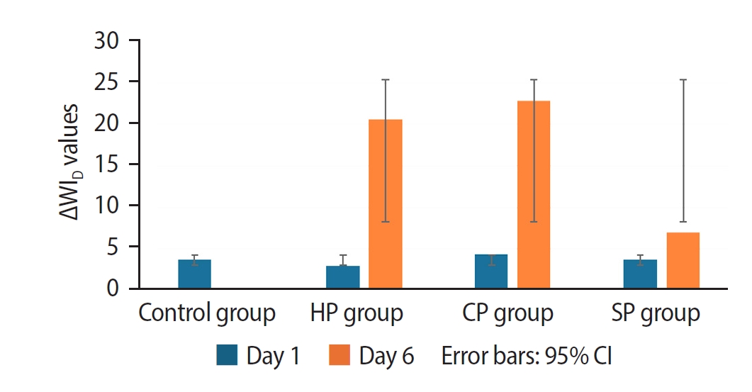 The interpretation of the delta E value as a metric for change in color provides a robust indication of the efficacy of a bleaching treatment. Further validation of this metric is provided by the whitening index, which has been demonstrated to offer enhanced analytical power. The CIELAB-supported whitening index developed by Pérez et al. [27] has been evaluated in comparison to numerous other whitening indices and has been shown to be a reliable indicator. In our study, we have also examined the extent of tooth bleaching using the WID, providing a comprehensive assessment of the treatment’s effectiveness.