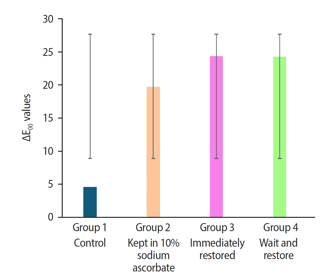 Despite this, there remains a paucity of studies investigating the impact of sodium ascorbate on color stability after bleaching. The present study sought to ascertain whether sodium ascorbate indirectly influences recoloration by affecting energy exchange on the tooth surface and the sealing efficacy of composite restorations. Notably, an increased incidence of recoloring was observed in the bleached teeth group compared to the control group. Furthermore, no statistically significant differences were found between delaying restoration for one week to allow for HP neutralization, the application of sodium ascorbate as an antioxidant, or immediate restoration application.