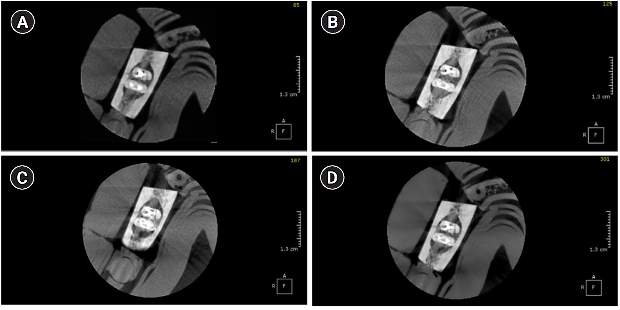 Axial cone-beam computed tomography slices of a sample tooth without post acquired on the four protocols. (A) Low dose resolution, (B) standard resolution, (C) high resolution, and (D) endo resolution.