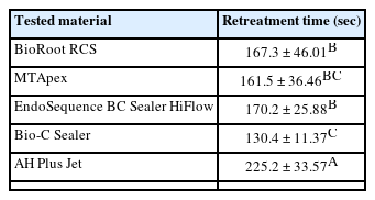 Table 2. Patency was reestablished in all specimens. AH Plus Jet demanded the longest mean retreatment time compared to all other materials (
