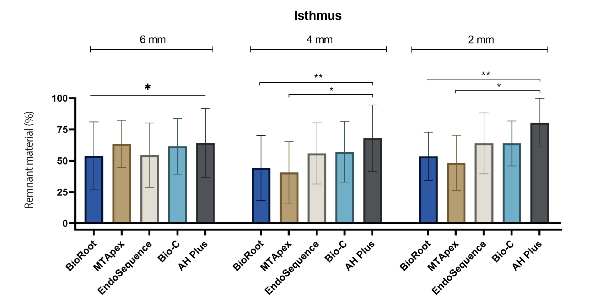 Representation of the mean and standard deviation values in percentage of remnant filling material in isthmuses at the 6-, 4- and 2-mm levels. Bars linking different materials with asterisks indicate statistically significant differences (*p < 0.05, **p < 0.01). Manufacturer information for each material is provided in Table 1.