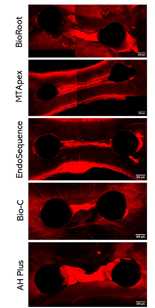 According to a previous method [15] for confocal microscopy analysis, the sealers were mixed with rhodamine B 0.1% dye before their insertion into the root canals. After completing the obturation, the teeth were placed in containers with moistened gauze and stored in a humid oven at 37ºC for 1 month. In sequence, samples underwent a canal retreatment procedure. For this procedure, all teeth were retreated using R40 (VDW GmbH) and instrumentation supplemented with XP-endo Finisher R, with 2.5% sodium hypochlorite irrigation using a syringe with a 30-G Navitip needle until reestablishing apical patency.
