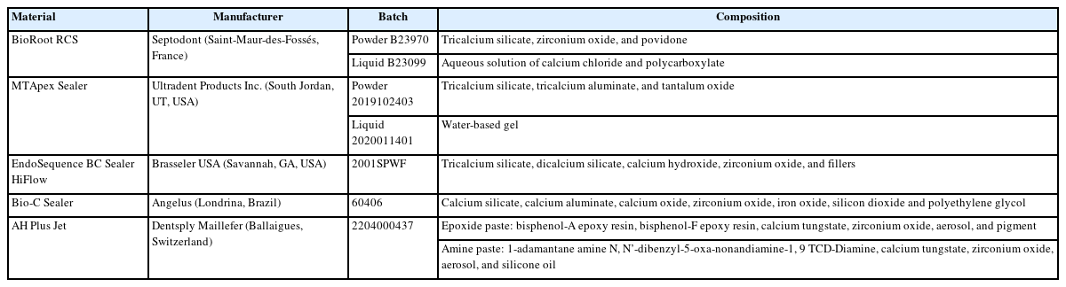 The sample size for human teeth was determined using G*Power v3.1 (Heinrich-Heine-Universität Düsseldorf, Germany), based on prior studies [13,15]. For analysis of variance (ANOVA) comparison of four groups, a standard deviation of 0.26, a minimum detectable difference of 0.15, a test power of 0.80, and an alpha of 0.05 indicated 20 teeth per group. Similarly, the sample size for sealer setting time analysis was calculated using prior studies [18,19] and a pilot study, with an alpha of 0.05, power of 0.80, and an effect size of 2.45, resulting in six samples per group.