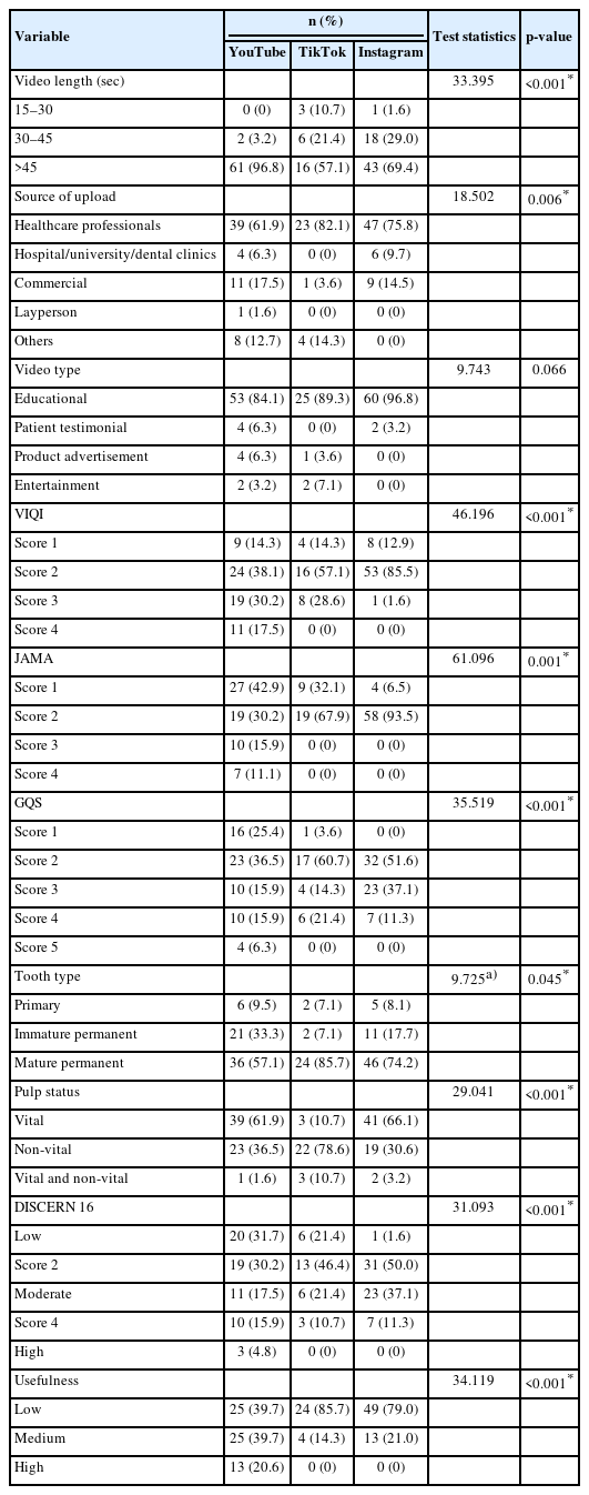 Significant relationships existed between video length, source of upload, usefulness score, tooth type, pulp status, and VIQI, JAMA, GQS, and DISCERN scores for all three platforms (p < 0.05). A statistically significant relationship existed of YouTube, TikTok, and Instagram with the number of views, number of months since upload, view rates, comments and likes (p < 0.05).