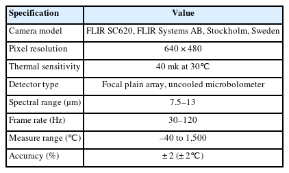 The IRT camera used to measure surface temperature changes during polymerization in this study was the FLIR SC620 (FLIR Systems AB, Stockholm, Sweden) (Figure 1). IRT is a science that acquires and analyzes thermal information obtained from a non-contact thermal imaging device (camera). IRT measures the total emitted radiation energy, which includes energy absorbed by the object from external heat sources and radiated by the object itself, as well as energy reflected and transmitted by the object from external heat sources. This total emitted radiation energy is converted into thermal images based on infrared radiation wavelengths.