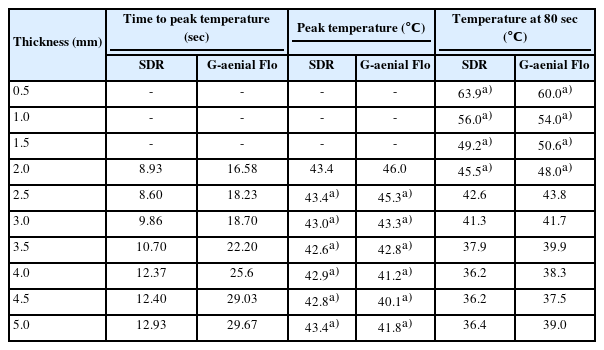 Descriptive comparison of time to peak temperature, peak temperature, and temperature at 80 seconds for SDR and G-aenial Flo at each thickness