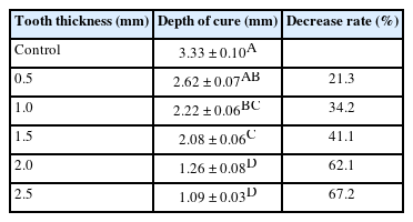 The results demonstrated that light transmittance significantly decreased as tooth thickness increased (p < 0.01), leading to reduced resin polymerization. In the 2.0-mm and 2.5-mm tooth thickness groups, the depth of cure was significantly lower than in the control group without tooth specimens (p < 0.05).