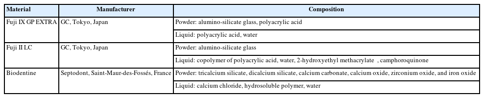 Artificial carious lesions were restored by CSC, GIC, or RMGIC (n = 5). The material compositions are summarized in Table 1. All materials were used according to the manufacturer’s recommendation. The set samples were then stored in artificial saliva (C8H8O3, 13.2 mM; KCl, 8.4 mM; MgCl2, 0.3 mM; K2HPO4, 4.6 mM; KH2PO4, 2.4 mM; CaCl2, 1.1 mM; and sodium carboxymethyl cellulose, 41.3 mM) adjusted to 7.2 pH for 1 week at room temperature (25⁰C) to simulate the oral environmental condition and to keep their hydration state [17].