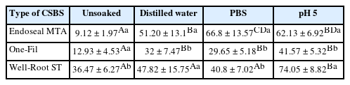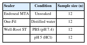Table 2.Sealers tested under four conditions (unsoaked, distilled Water, PBS, pH 5) with 12 samples per condition