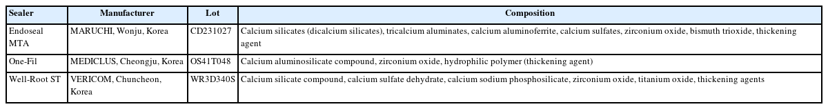 Three commercially available premixed CSBSs, Endoseal MTA (MARUCHI, Wonju, Korea), One-Fil (MEDICLUS, Cheongju, Korea), and Well-Root ST (VERICOM, Chuncheon, Korea), were evaluated. The chemical compositions of the sealers are listed in Table 1. All samples were analyzed before the manufacturers’ specified expiration dates.