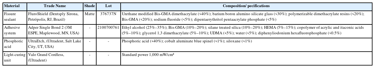 This in vitro experimental study investigated the dependent variables: DC, IEBS, failure mode, antimicrobial activity, and release of the active principle. The independent variables consisted of different concentrations of the powdered S. brasiliensis stem extract (0 wt%, 1.25 wt%, 2.5 wt%, 5 wt%, 10 wt%, and 20 wt%). The sample size was defined for each test according to previous investigations [12–16], and the specimens underwent testing in a randomized manner through a selection process utilizing numerical identifiers corresponding to the specimens within each group. The materials and instruments used in this investigation are shown in Table 1.