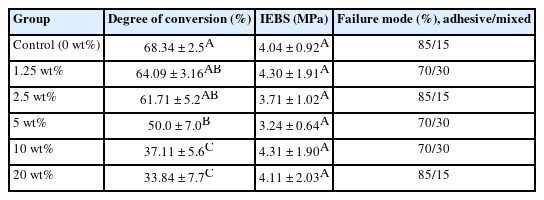 The degree of conversion, IEBS, and failure mode according to the different concentrations of powered Schinopsis brasiliensis stem extract (p < 0.05)