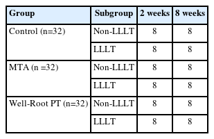 The incisor teeth were randomly evaluated by three independent observers who were blinded to the material and technique used. Only the allocator (M.A.S) was aware of the group assignments, which corresponded to the different capping materials. Using a split-mouth design, the teeth were randomly allocated to one of three groups according to a computer-generated random sequence (Microsoft Excel RAND function) prepared by an investigator independent of the surgical procedures. For each dog, the 12 incisors were allocated so that each group (Well-Root PT, MTA, and control) was represented by four teeth per dog. Within each group, two teeth were assigned to the LLLT subgroup and two to the non-LLLT subgroup. The dogs were randomly assigned to be euthanized at either 2 weeks (dogs 1–4) or 8 weeks (dogs 5–8), ensuring equal numbers for each period (