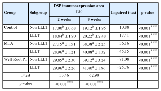 At the 2-week evaluation, the highest mean area percentage of DSP expression was observed in the LLLT Well-Root PT subgroup, followed by the non-LLLT Well-Root PT, the LLLT MTA, and the non-LLLT MTA subgroups. The control group exhibited the lowest levels. By the 8-week time point, a similar trend persisted; however, the LLLT MTA subgroup showed a slightly higher mean value than the non-LLLT Well-Root PT subgroup. In intragroup comparisons, all subgroups showed a statistically significant increase in DSP mean area percentage from 2 to 8 weeks (