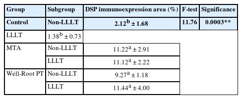 Both the Well-Root PT and MTA groups showed significantly increased DSP expression compared to the control group at both 2 and 8 weeks (p < 0.05). No significant difference in the mean area percentage of DSP expression was found between the Well-Root PT and MTA groups. The diode laser application did not produce a significant effect on DSP expression. Within-group comparison revealed a significant increase in DSP expression between the 2- and 8-week follow-up periods (p < 0.05).