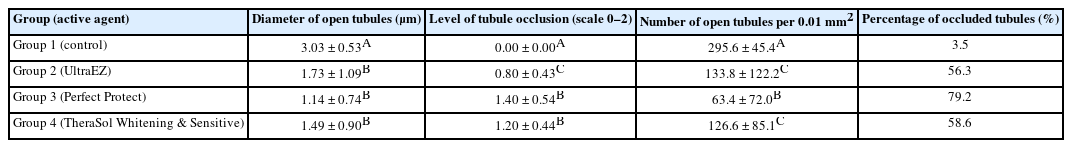 SEM observations showed no occlusion of dentin tubules in the control group, whereas groups 2 to 4 exhibited significant occlusion. The most effective treatment was Perfect Protect (p < 0.05), while UltraEZ and TheraSol Whitening & Sensitive demonstrated similar effectiveness, with no statistically significant difference between them (p > 0.05).