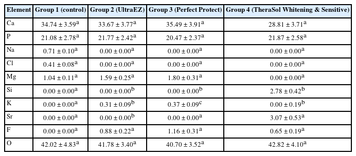 1: control, 2: UltraEZ (Ultradent Products Inc., South Jordan, UT, USA), 3: Perfect Protect (VOCO GmbH, Cuxhaven, Germany), and 4: TheraSol Whitening & Sensitive (ABC Kinitron IKE, Athens, Greece).