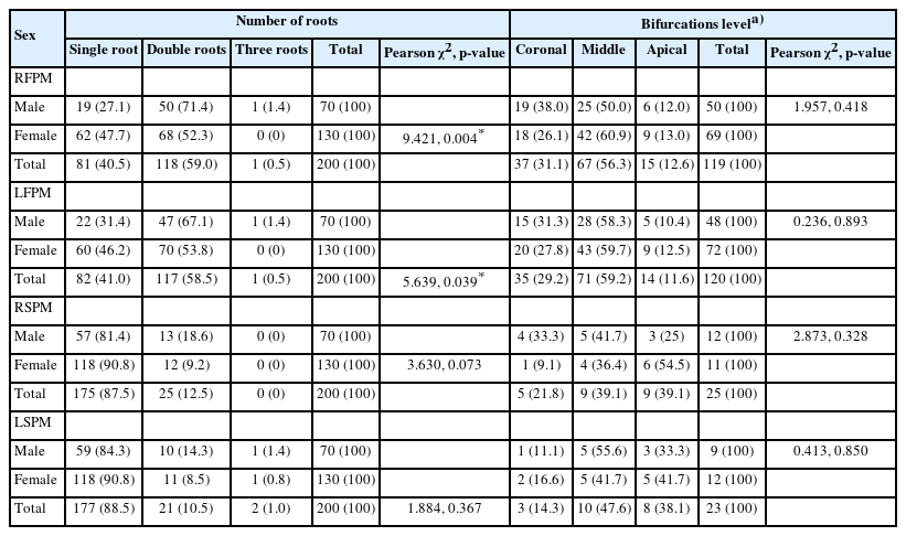 The majority of the right maxillary first premolars (RFPM) had two roots (118/200, 59%), occurring in 71.4% of males and 52.3% of females. Likewise, the majority of the left maxillary first premolars (LFPM) had two roots (117/200, 58.5%), with frequencies of 67.1% in males and 53.8% in females. Single-rooted RFPMs were less common, occurring in 81 of 200 teeth (40.5%), with a prevalence of 47.7% in females and 27.1% in males. In LFPM, single roots were also less common (82/200, 41.0%), occurring in 46.2% of females and 31.4% of males. Three-rooted configurations were rare, occurring in only 0.5% of both RFPM and LFPM, and were exclusively observed in males. The association between root number and sex was statistically significant in both RFPM and LFPM (p = 0.004 and p = 0.039, respectively).