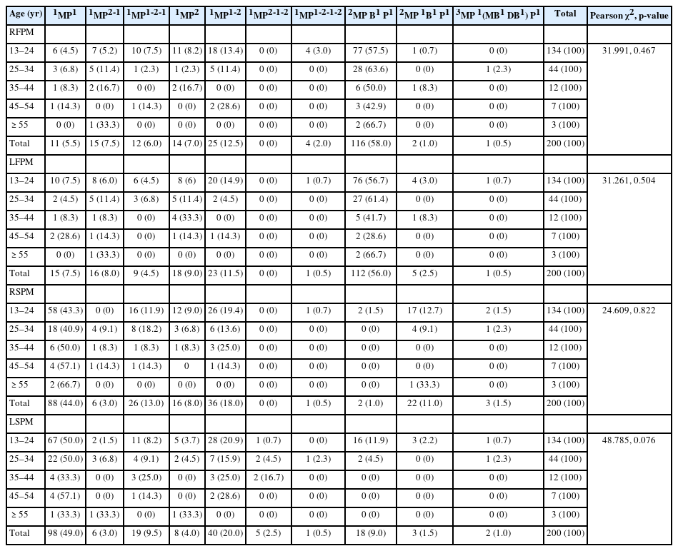 This is the first study to use Ahmed’s classification among Jordanians. Type 2MP B1 P1 had the highest prevalence in both RFPM and LFPM (58.0% and 56.0%, respectively), with no significant differences by sex or age (Tables 3 and 5). This is in line with research by Saber et al. [11] and Buchanan et al. [19], which also revealed that 2MP B1 P1 had the highest prevalence (52.5% and 52.53%, respectively).