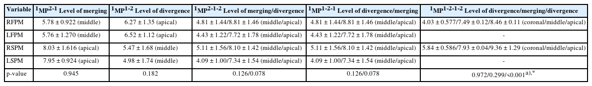 The levels of merging and diverging of canals are summarized in Table 6. In the 1MP2-1 configuration, canal merging occurred at the middle of the root for both RFPM and LFPM, while in the apical third in RSPM and LSPM. There was no statistical significance in the level of merging across the teeth.