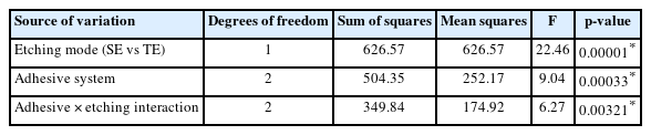 Two-way analysis of variance for the effects of adhesive system and etching mode on micro-shear bond strength