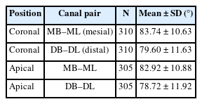 Furthermore, our analysis was limited to radiographic axes where root canals appeared to overlap, independent of the actual number of canals, as multiple canals are usually situated parallel to one another within the root’s center. To distinguish between a single and multiple canals clinically, a second X-ray taken at a greater horizontal angle is required. This reveals whether the canal, an inserted file, or gutta-percha is centered within the root’s outline. A noncentral position strongly suggests an additional canal. The behavior of these axes across different root canal morphologies was not investigated and represents a potential avenue for future research.