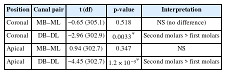 If distal canal separation remains inadequate, further increase up to approximately 40° may be considered on a case-by-case basis. Coronal overlap angles were consistently higher than apical ones, confirming the increasing canal divergence toward the root apex [26]. Consequently, apical clarity should be prioritized during working length determination and obturation control. The significantly higher distal overlap in second molars supports anatomical evidence of greater root curvature and divergence in this group [26].