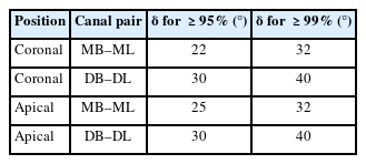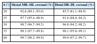 However, theoretical coverage analysis further quantified this relationship, revealing that mesial canals achieved ≥95% separability at δ approximately 25° and ≥99% at approximately 35°. Distal canal pairs required δ approximately 30° to reach 95% and approximately 40° to reach 99%, reflecting the flatter divergence trajectory of distal roots. Confidence intervals narrowed substantially between 25° and 35°, confirming statistical stability of the coverage plateau. These findings identify a narrow mesial beam angulation window in which most mesial and distal canals can be visualized simultaneously.