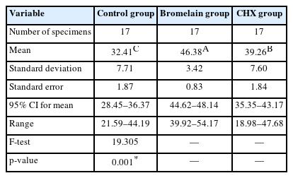 The samples were randomly assigned to three groups (n = 17) according to the dentin biomodification protocol, where each specimen was immersed for 1 minute in a plastic container containing equal amounts (3 mL) of the proposed dentin biomodifier. Group 1: Dentin surfaces biomodified with saline (control group) [12]. Group 2: Dentin surfaces biomodified with 8% bromelain solution, which was prepared by dissolving pure bromelain powder (8 g; Sigma Aldrich, Darmstadt, Germany) in DW (100 mL) [16,17]. Group 3: Dentin surfaces biomodified using 2% CHX (Consepsis; Ultradent Products, South Jordan, UT, USA) [13].