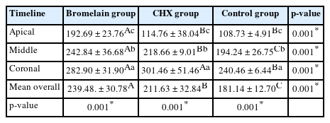 At the coronal level, the quantity of sealer penetration for CHX was the highest, followed by bromalin and the control groups. It could be clarified by the substantivity effect of CHX and the enlarged diameter of dentinal tubules coronally [29]. These results were inconsistent with an earlier investigation [30], which found that applying 17% EDTA after CHX gel (2%) for smear film elimination might be recommended, thereby enhancing AH Plus sealer (Dentsply DeTrey GmbH, Konstanz, Germany) penetration. The differences in the results might be related to variations in the evaluation methods or the types of roots used in the study.