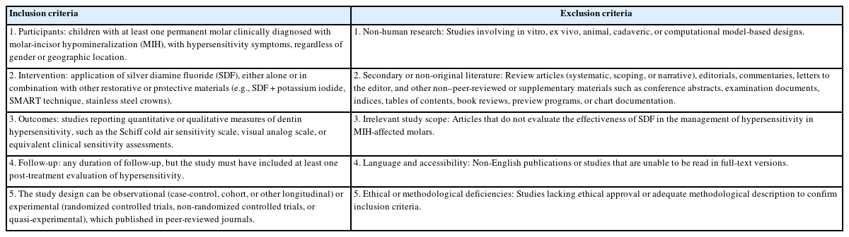 A primary research question was formulated for the research: “Evaluate the effectiveness of using SDF alone or in combination with restorative treatment in preventing hypersensitivity of teeth affected by MIH.” Also, the PICO (Population, Intervention, Comparison, and Outcomes) strategy was: population: MIH-affected molar undergoing hypersensitive treatment; intervention: SDF alone or in combination with restorative treatment, such as SDF-modified atraumatic restorative technique (SMART); comparison: teeth not undergoing treatment using SDF; outcomes: Schiff cold air sensitivity scale (SCASS).